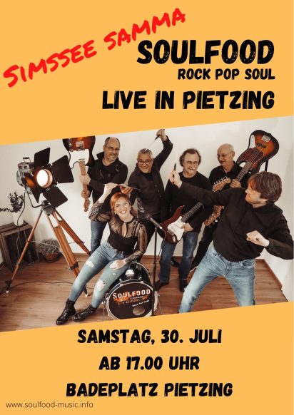 Nach vor einer Woche das Wetter nicht mitgespielt hat, spielt die Band Soulfood am Sonntagabend, 7. August ab 17.00 Uhr in Pietzing am Badeplatz. Gemütliche, sommerliche Atmosphäre mit Rock- Funk und Soulmusik und dazu die gute Bewirtung vom Kiosk versprechen einen entspannten Abend. Soulfood ist Musik und einfach Spass für die sechs Musiker und das Publikum, zum Zuhören, Ratschen und Mitgrooven. In der Besetzung. 2 Gitarren, Bass, E-Piano/Keyboard, Schlagzeug und Sängerin coverd die Band alte und neue Rock-, Pop- und Soulnummern in ihrem eigenen Stil. Von Adele bis Santana und von Amy Winehouse bis Leonhard Cohan soll die Musik von Soulfood einfach unterhalten, einen entspannten Abend bieten oder auch mitreißen.