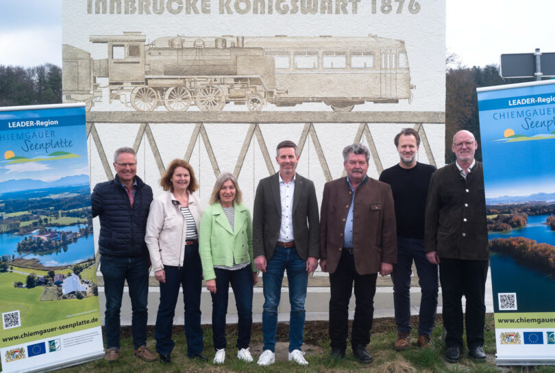 Das Trafohaus tut seit Jahrzehnten seinen Dienst, befand sich aber in keinem optisch ansprechenden Zustand mehr. So kam der Gartenbauverein auf die Idee, das zu verbessern. Erst einmal durch einen hellen Grundanstrich und dann mit Malereien mit einem örtlichen Bezug. Da lag es nahe, einmal die Königswarter Brücke zu nehmen, die der hiesigen Kunst- und Kirchenmaler Christof Böklen treffend umgesetzt hat. Eine Dampflok und ein Schienenbus drücken den zeitlichen Bezug bis in die Gegenwart der 1876 eröffneten Brücke aus. Dafür gewann der Gartenbauverein nicht nur den Maler, sondern auch die Kraftwerke Haag als Besitzer des Trafohauses, dazu Firmen als Sponsoren und die Lokale Aktionsgruppe Chiemgauer Seenplatte, deren Mitglied die Gemeinde sei, wie Bürgermeister Thomas Weber erklärte. Im Rahmen ihres Projekts „Bürgerengagement in der Chiemgauer Seenplatte“ werden 1.000 Euro zu den Gesamtkosten von 6.300 Euro beigesteuert.