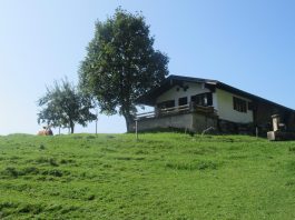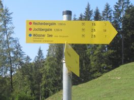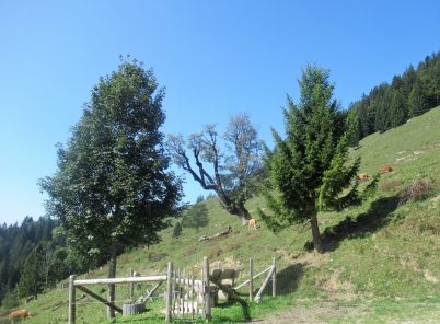 Also wieder nix mit Faulenzen, aber ich wollte eh schon lange einmal vom Wössener See auf die Rechenbergalm. Den Weg von dort kenne ich teilweise schon, hat mir aber nicht so besonders gefallen. Schöner und kürzer soll es von Brem aus sein. Wir starten daher am Wanderparkplatz in Brem und wundern uns, denn es sind gar nicht so viele Gleichgesinnte, die den freien Tag und das schöne Wanderwetter ausnutzen wollen. Wir laufen auf breitem, nicht sehr stark ansteigem Weg, bis zur Burgaualm. Jetzt geht es aussichtsreich weiter über freies Almgelände und dann ein Stück auf schmalem Steig auch nicht besonders steil durch den Wald bis wir auf die von Unterwössen heraufkommende Almstraße stossen, auf der es wieder aussichtsreich bis zur Rechenbergalm weiter geht.