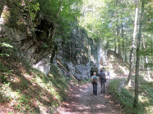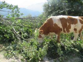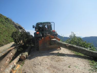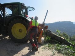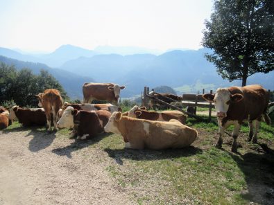 Kurz vor der Alm gibt es noch einen Stau: Baumfällarbeiten. Macht aber nichts, denn es ist ganz interessant zu sehen, wie ein mächtiger Baum umgesägt und abtransportiert wird. Nachdem der Weg wieder frei ist, sind wir gleich bei der Alm und haben auch Glück, daß wir einen freien Tisch bekommen. Es gibt nur almübliche Brotzeiten. Speckbrot und Käse schmecken aber ausgezeichnet und den Käse gibt es sogar “ToGo”, was wir auch machen.