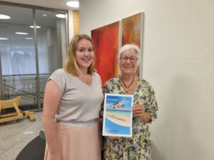 Die Individualbetreuerin der Sparkasse Rosenheim-Bad Aibling, Victoria Posner (links), freut sich mit Lidwina Maria Epple. Die Kundin hat bei der PS-Los-Sonderauslosung einen Reisegutschein gewonnen. Jetzt will sie mit ihren Enkeln ans Meer fahren.