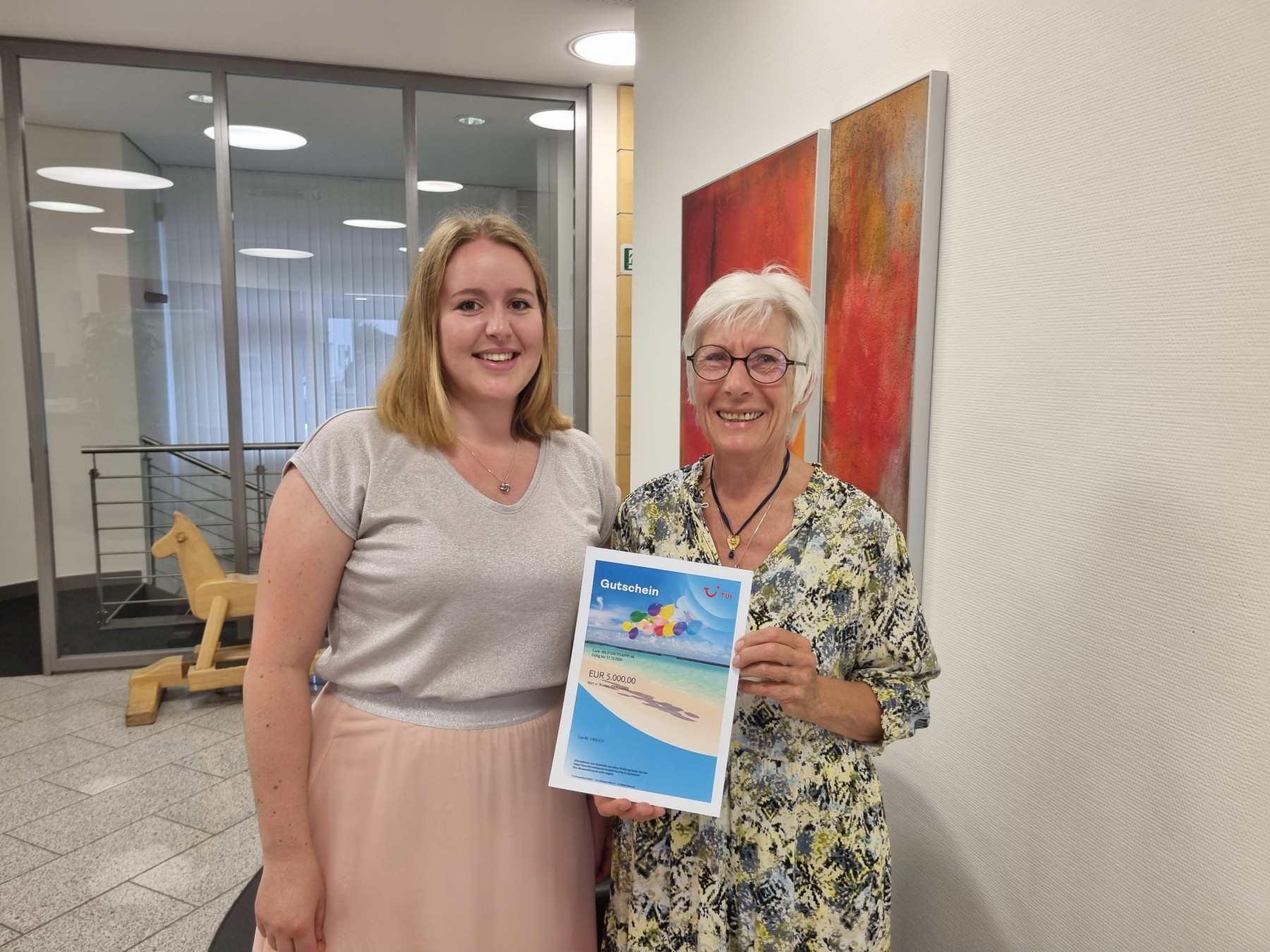 Die Individualbetreuerin der Sparkasse Rosenheim-Bad Aibling, Victoria Posner (links), freut sich mit Lidwina Maria Epple. Die Kundin hat bei der PS-Los-Sonderauslosung einen Reisegutschein gewonnen. Jetzt will sie mit ihren Enkeln ans Meer fahren.