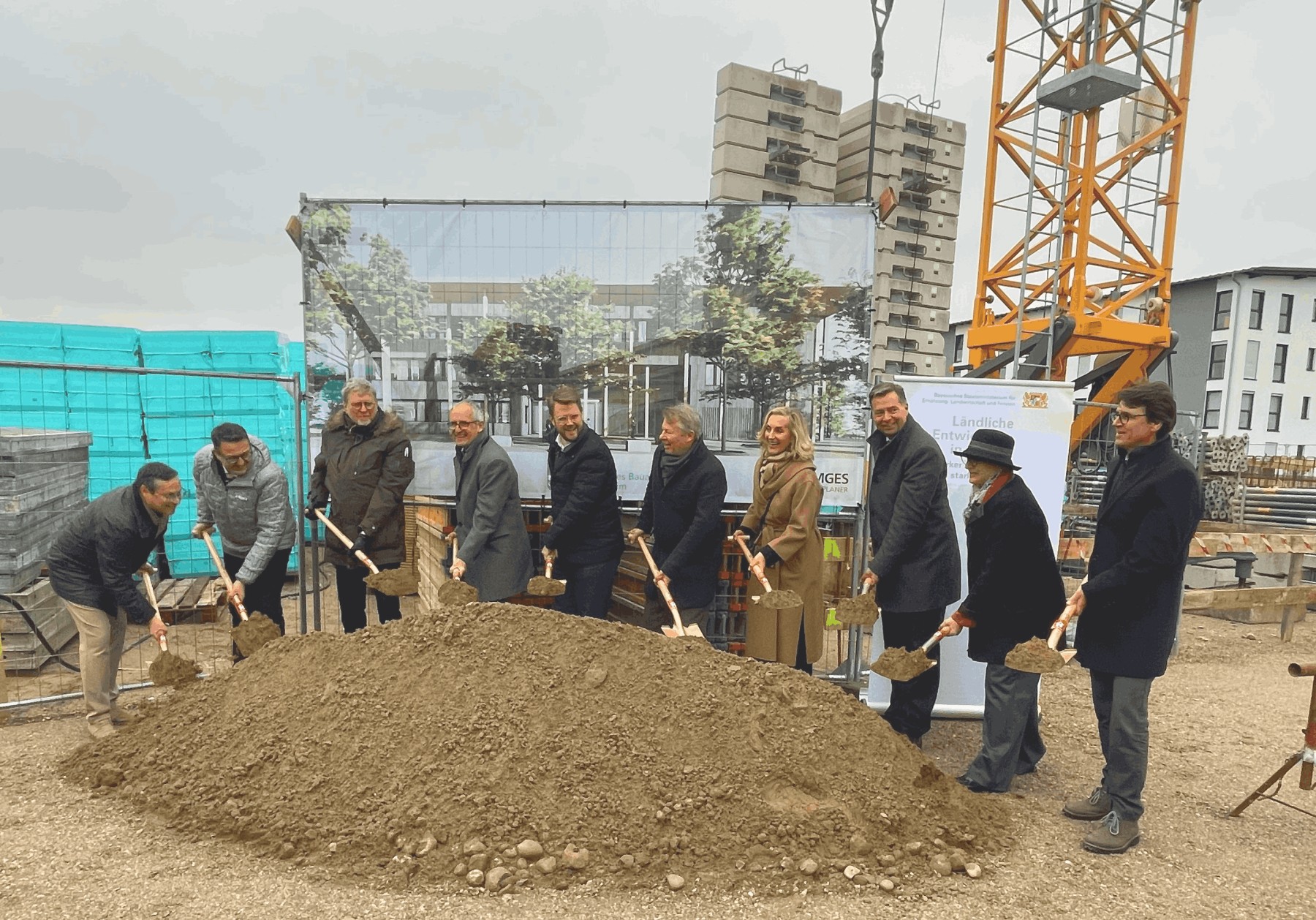 (v.l.n.r.) Markus Saller (Freie Wähler), Roland Spiller (Ministerialdirigent und Abteilungsleiter „Ländlicher Raum und Nachwachsende Rohstoffe, Verwaltung für Ländliche Entwicklung“, StMELF), Dr. Marcel Huber (Staatsminister a.D.), Rolf Meindl (Behördenleiter ALE Obb.), Thomas Eckert (Dömges Architekten AG), Michael Hetzel (1. BM, Stadt Mühldorf), Bernd Hillebrand (Hillebrand Bau GmbH), Doris Lackerbauer (Leiterin Staatliches Bauamt Rosenheim), Stephan Mayer (MdB), Ilse Preisinger-Sontag (stellv. Landrätin d. Lkr. Mühldorf) beim gemeinsamen Spatenstich für das neue Dienstgebäude des ALE Oberbayern in Mühldorf. © S.Frees/StMELF – Amt für Ländliche Entwicklung Oberbayern