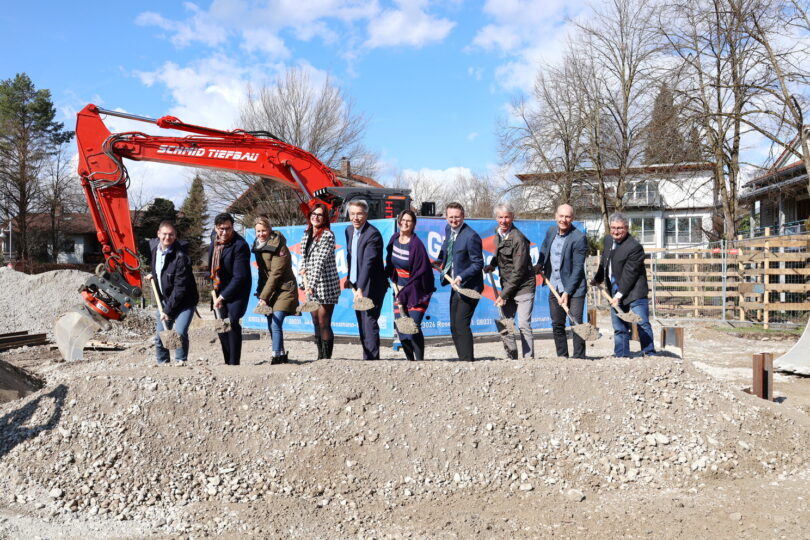 Bericht und Bild: LRA Rosenheim – Spatenstich für den Erweiterungsbau des Sonderpädagogischen Förderzentrums (v. li.n.re.): Matthias Götz Fa. Grossmann, Laurenz Motzet und Stefanie Willeke vom Architekturbüro LMJD, die stellv. Schulleiterin Karin Persch, Landrat Otto Lederer, Schulleiterin Angelika Held, Bürgermeister Stephan Schlier, Kreisrat Felix Schwaller, Leiter der Abteilung Hoch- und Tiefbau im Landratsamt Martin Rodemers und Kreisrat Stefan Lederwascher. Foto: Landratsamt Rosenheim