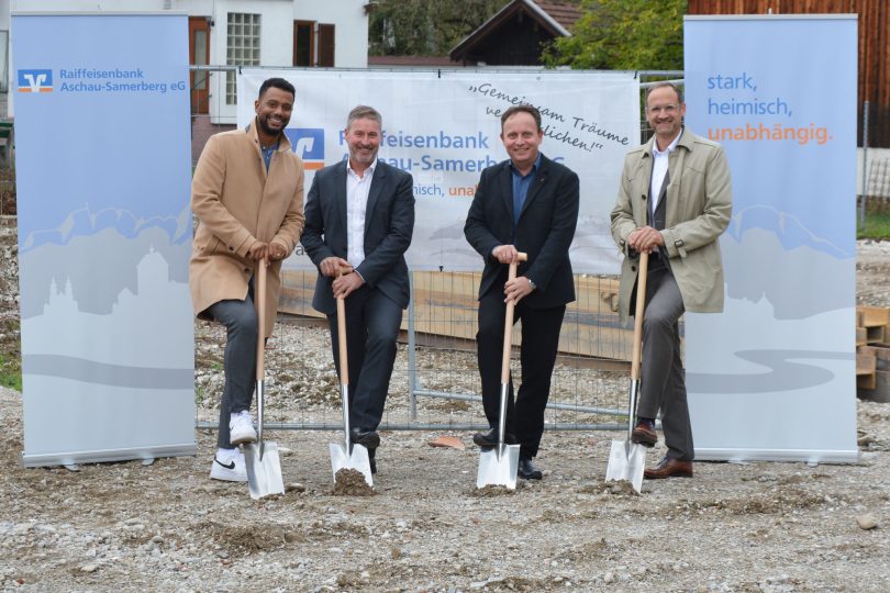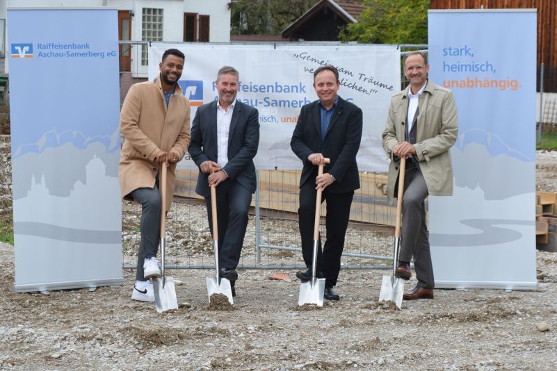 Der 19. September war ein weiterer Meilenstein für die Raiffeisenbank Aschau-Samerberg eG. Die beiden Vorstände Christian Trattner und Daniel Sauer setzten gemeinsam mit Bürgermeister Daniel Mair und Architekt Fabian Gath den Spatenstich für den Bau des neuen Geschäfts- und Wohnhauses in Frasdorf.