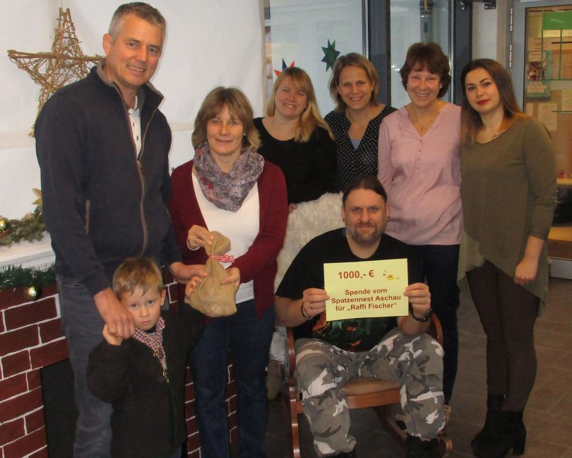 Bericht und Foto: Heinrich Rehberg – 1000 Euro übergaben Claudia Scheck, die Leiterin der Aschauer Kindertagesstätte Spatzennest (zweite von links) und der Elternbeirat als finanzielle Hilfe für Raffi Fischer an Andreas Fischer (links)
