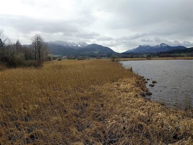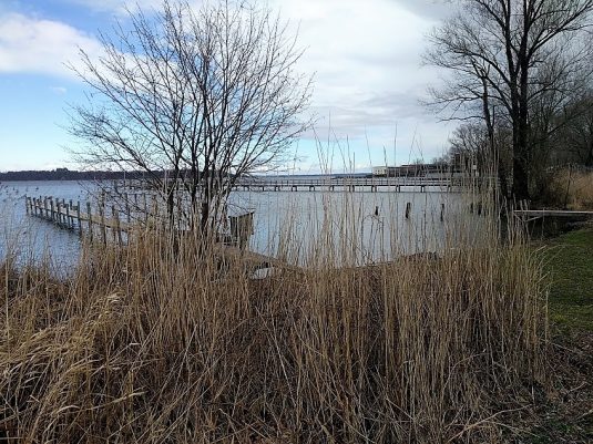 Es ist kalt und windig am Chiemsee, aber die Wolken lichten sich und im Westen zeigt sich sogar ein blauer Streifen am Himmel. Die Berge, gerade noch in ein dichtes Wolkenkleid gehüllt, zeigen sich nach und nach, auch die Kampenwand ist schon sichtbar.