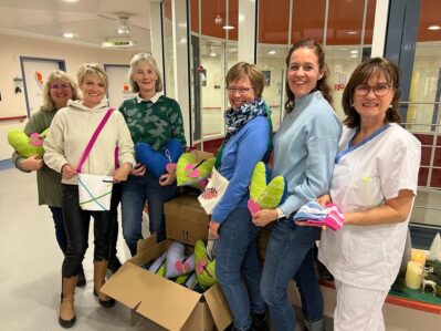 Vor kurzem kam eine weitere Anfrage aus der Klinik in Bad Reichenhall, dort haben sie zurzeit erhöhten Bedarf an Herzkissen für Brustkrebs-Patientinnen. In Windeseile wurde Füllwatte bestellt, die Kosten dafür hat dankenswerter Weise Hans Schartner übernommen, die Herzkissen lagen schon fertig genäht bereit und wurden von sieben Frauen kurzfristig gefüllt und verschlossen. So fuhren vier Damen von der Frauenbewegung am 12. Dezember mit 50 Herzkissen und 70 Drainage Taschen im Gepäck nach Bad Reichenhall, dort wurden sie bereits von der Stationsleitung Verena Hellmann und Schwester Karin erwartet. Die beiden freuten sich im Namen ihrer Patientinnen sehr über die schnelle, unkomplizierte Hilfe. Mit dabei hatten die Frauen auch gestrickte Babymützchen. Die Hebammen sind wieder darauf bedacht den Babys Mützchen aufzusetzen, 80 % der Körperwärme geht über den Kopf verloren.