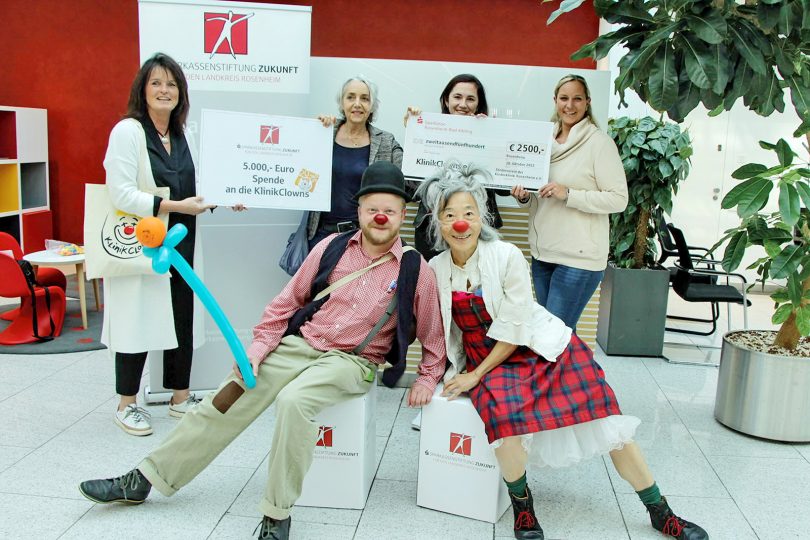 Ermöglicht wird dies durch die Unterstützung der Sparkassenstiftung Zukunft für den Landkreis Rosenheim und des Fördervereins der Kinderklinik Rosenheim e.V. . Am Freitag, 28.10.2022, dem Weltspartag, waren die KlinikClowns „Muck“ und „Lulu“ zu Gast in der Sparkasse Rosenheim-Bad Aibling und durften zu ihrer großen Freude die diesjährigen Spenden entgegennehmen. Im Namen der Sparkassenstiftung Zukunft für den Landkreis Rosenheim überreichte Stiftungsberaterin Doris Räder den Clowns und Andrea Andrade von KlinikClowns Bayern e.V. 5000 Euro. Vom Förderverein der Kinderklinik Rosenheim überreichten ihnen die stellvertretende Vorsitzende Jasmin Harre-Göhsl und die Schatzmeisterin Sanja Cvetko 2500 Euro. Gemeinsam ermöglichen die beiden Organisationen so wieder ein ganzes Jahr lang „Clownsvisiten“ bei kranken Kindern in Rosenheim. „Muck“ und „Lulu“ bedankten sich herzlich und erfreuten die Sparkassenbesucher am Weltspartag mit ihrer clownesken Improvisationskunst. Seit 2007 übernimmt der Förderverein der Kinderklinik Rosenheim e.V. zuverlässig einen Teil der Finanzierung. Seit 2016 tragen die Sparkassenstiftung Zukunft für die Stadt im Wechsel mit der Sparkassenstiftung Zukunft für den Landkreis Rosenheim sowie der Förderverein die kompletten Kosten gemeinsam.