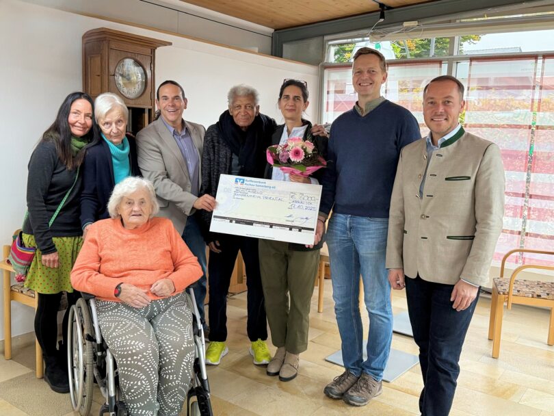 Das restlos ausverkaufte Konzert „Aschau Blue“, war ein Geschenk an Aschau i.Chiemgau, mit dem der 91jährige Abdullah Ibrahim seine tiefe Verbundenheit zur Region und den Menschen zum Ausdruck brachte. Nun überreichte Abdullah Ibrahim gemeinsam mit seiner Frau Marina Umari den stattlichen Erlös von 6000 € feierlich an die Heimleitung, Hr. Rohrmüller (3.v.l.) und den Bewohnern des Seniorenheims. Bürgermeister Simon Frank (2.v.r.) und Tourismuschef Herbert Reiter (rechts) waren bei der Übergabe mit dabei und bedankten sich nochmals persönlich bei Abdullah Ibrahim für seinen selbstlosen Einsatz und das unvergessliche Konzert.