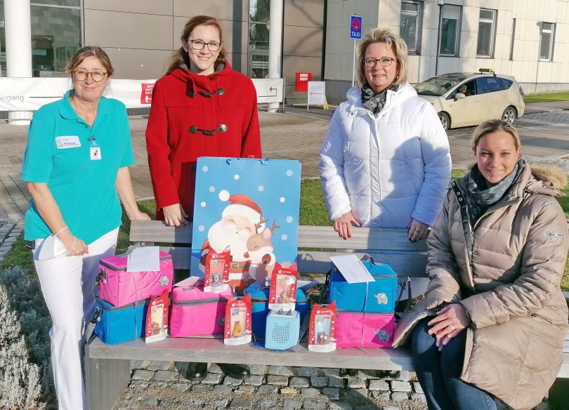 Kurz vor Weihnachten war es endlich soweit: der Förderverein der Kinderklinik Rosenheim e.V., vertreten durch die 1. Vorsitzende Mihaela Hammer (2 v. r.), die 2. Vorsitzende Jasmin Harre-Göhsl (2. v. l.) und Kassiererin Sanja Cvetka (1. v. r.) überreichten der Kinderklink am RoMed Klinikum Rosenheim sechs Tonieboxen samt umfangreichem Zubehör. Gesundheits- und Krankenpflegerin Andrea Riepertinger (1. v. l.) nahm die Geschenke stellvertretend für alle Kinderstationen in Empfang. Die Freude war sehr groß, denn die Tonieboxen waren ein Herzenswunsch des Personals. „Für unsere kleinen Patienten und Patientinnen können wir jetzt schnell und unkompliziert eine angenehmere, entspanntere Atmosphäre schaffen“, berichtete Frau Riepertinger. Der Spendenwert für die Tonieboxen incl. Figuren und Taschen beträgt 1.000 Euro.