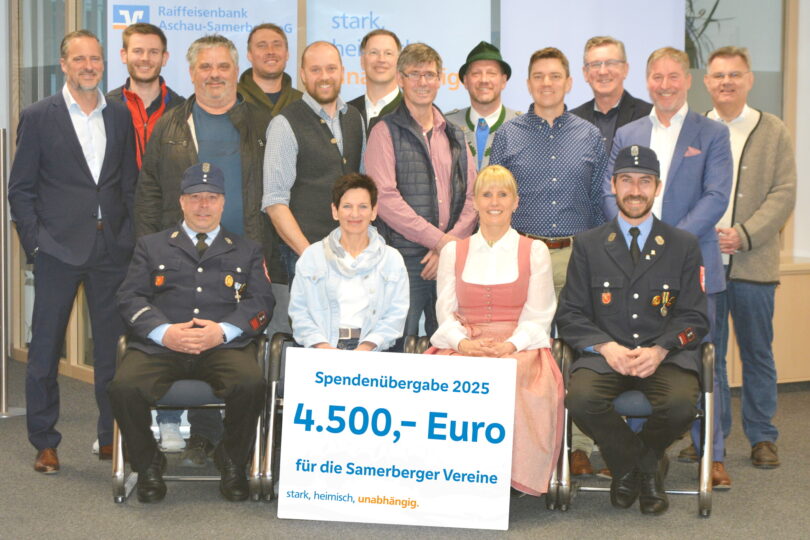 Mit insgesamt 16.050 Euro hat die Raiffeisenbank Aschau-Samerberg eG die in ihrem Geschäftsgebiet tätigen Gemeinschaften unterstützt.  In einem feierlichen Rahmen gab es die Spenden an die verschiedenen Vereine, Schulen und soziale Einrichtungen  im Beisein der Bürgermeister Simon Frank aus Aschau i. Chiemgau, Daniel Mair aus Frasdorf und Georg Huber vom Samerberg.