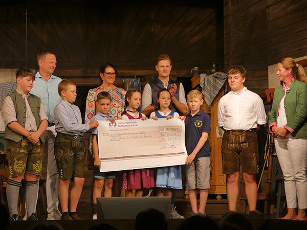 Eingeleitet von der Seeleitn Musi öffnete sich pünktlich um 20 Uhr der Vorhang und präsentierte Frau Veronika Bergau, Projektmanagerin der Stiftung “Ein Platz für Kinder”, die Familie Miedl aus Bad Endorf sowie alle Kinder, die bei den Aufführungen des religiösen Stücks “Bruder Konrad – Mit großem Vertrauen” den Zuschauern ein von der Firma Miedl gestiftetes Bruder Konrad Brot überreichten und Spendengeld entgegennahmen, das dem Therapeutischen Internat Sternstunden Mattisburg am Chiemsee in vollem Umfang zur Verfügung gestellt wird. Erster Vorstand Konrad Schlaipfer überreichte Frau Bergau einen Scheck in Höhe etwas über 8.000 Euro, den diese sichtlich gerührt entgegennahm. Das Geld soll traumatisierten Kindern zwischen vier und zwölf Jahren aus der Region helfen, die die an den Folgen von massiver Vernachlässigung, Misshandlung oder sexuellem Missbrauch leiden. Die Theatergesellschaft Bad Endorf ist stolz darauf, einen Beitrag zu dieser bedeutenden Arbeit leisten zu können.