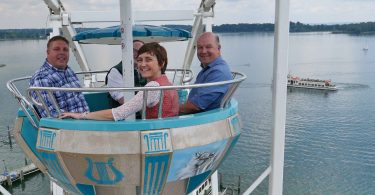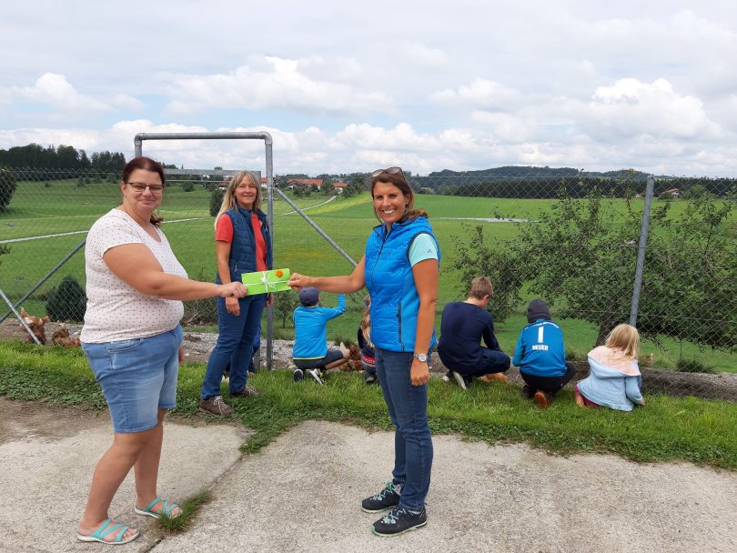 Foto: Übergabe der Spende des Elternbeirates der FH Grundschule an die Mittagsbetreuung im Rahmen eines Ausfluges mit den Ferienbetreuungskindern. Von links: Elternbeiratsvorsitzende Tanja Kühnlein, Betreuerin Sonja Neufang, Koordinatorin der Mittagsbetreuung Nicola Jaworek, im Hintergrund Betreuungskinder.