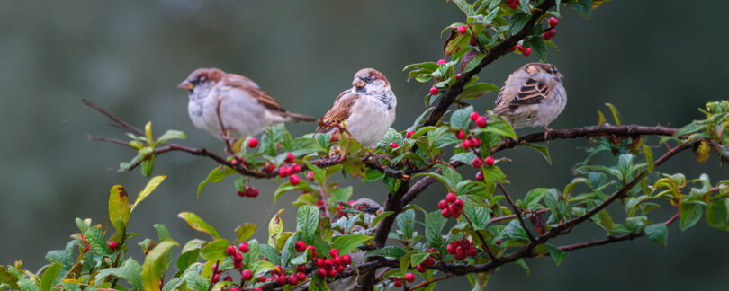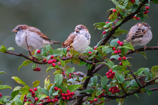 - Am kleinen Badeplatz hatten sich Sperlinge in einem Busch Zwergmispeln niedergelassen. Immer wieder sind sie auf den Boden geflogen, um hier zu picken.