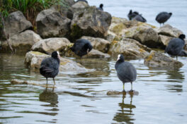 - In der Bucht sind sehr viele Blesshühner, die sich auf den Steinen sitzend, ihre Federn putzten.
