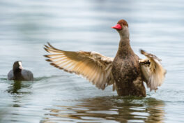 - Die Kolbenente war mit der Gefiederpflege fertig und hat dies mit heftigen Flügelschlagen bekräftigt.