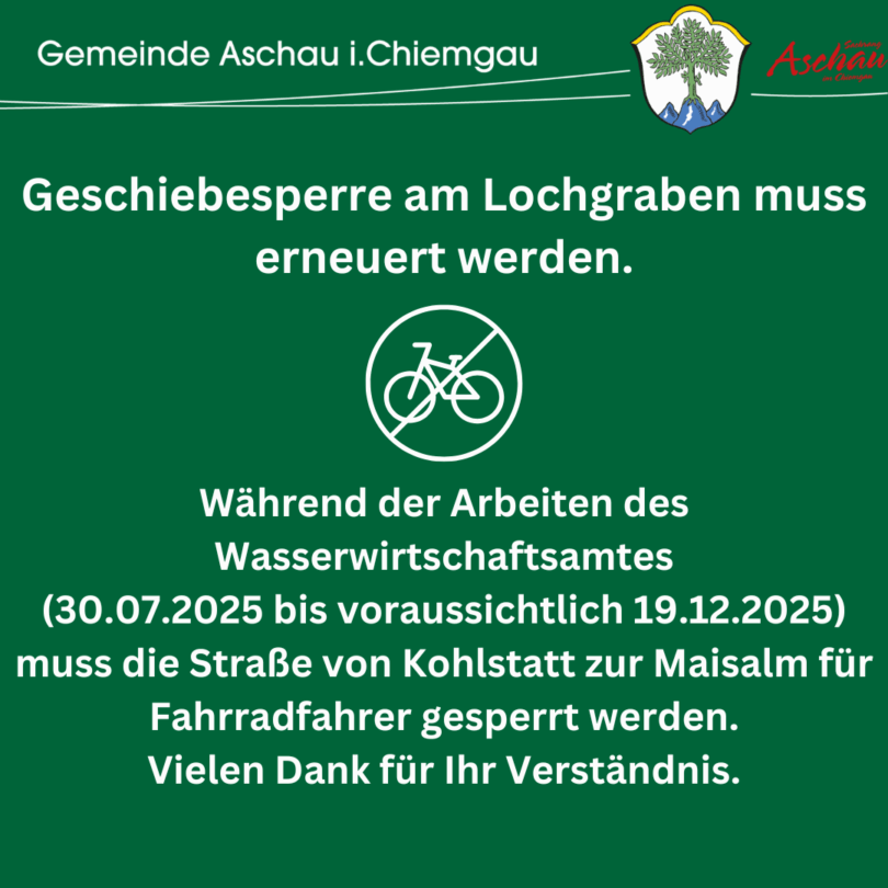Während der Arbeiten des Wasserwirtschaftsamtes (30.07.2025 bis voraussichtlich 19.12.2025) muss die Straße von Kohlstatt zur Maisalm für Fahrradfahrer gesperrt werden. Vielen Dank für Ihr Verständnis.