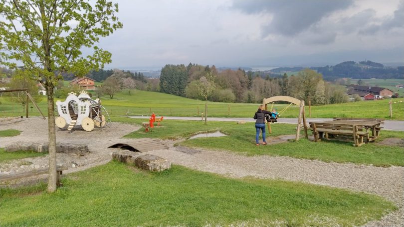 Zu den aussichtsreichsten Spielplätzen im Chiemgau zählt jener auf der Ratzingerhöhe oberhalb von Greimharting in der Gemeinde Rimsting. Auch dort halten sich Jung und Alt an die Abstandsregeln, an den aktuellen kühlen und zum Teil regnerischen Wettertagen hielt sich der Besuch sogar in starken Grenzen.