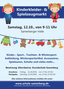 Der Elternbeirat der Grundschule Samerberg veranstaltet am Samstag 12.10. von 9.00 bis 11.00 Uhr den Herbst/Winter Spielzeug- und Kinderkleidermarkt in der Samerberger Halle. Es ist bestimmt wieder für jeden etwas dabei. Für das leibliche Wohl sorgt ein reichhaltiges Kaffee- und Kuchenbuffet. Der Elternbeirat freut sich auf viele Gäste.
