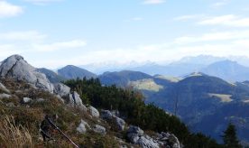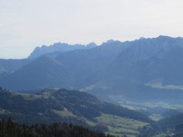 Das Panorama am Gipfelkreuz ist wirklich grandios, man sieht von den Berchtesgadener Alpen über die Reiteralpe, die Loferer Steinberge, das Kaisergebirge bis hinein in die Hohen Tauern, Zillertaler Alpen und das Karwendel.