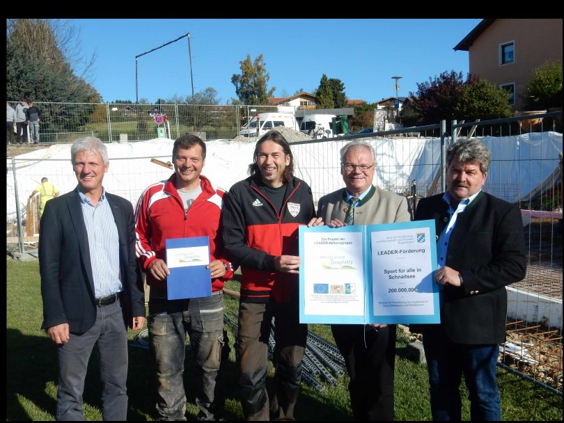 Der TSV Schnaitsee will den Neubau seines Sportheims für die Schaffung einer modernen Infrastruktur für seine Sportanlage und für die Erweiterung seines Kursangebots nutzen, vor allem auf Sport für Ältere und für Menschen mit Einschränkungen, für gesundheits- und Rehasport. Ermöglicht wird das dem Schnaitseer Sportverein nun durch eine Finanzspritze von rund 200000 Euro aus EU-Fördermitteln. Aus den Händen von Georg Baumgartner vom Amt für Ernährung, Landwirtschaft und Forsten (AELF) Rosenheim erhielten die TSV-Vorsitzenden Günter Edlmann und Manfred Heistracher die Zusage.