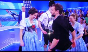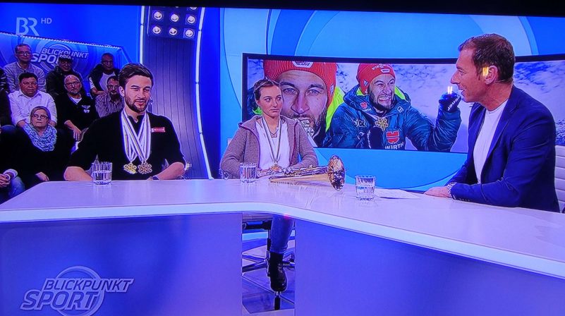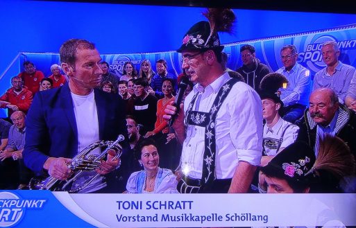 Wie sehr und wie gut Sport und Brauchtum zusammenpassen, das zeigte sich bei der jüngsten Blickpunkt-Sport-Sendung im Bayerischen Fernsehen. Die jüngsten Weltmeister im Mannschafts-Skispringen im tirolerischen Seefeld Markus Eisenbichler aus Siegsdorf und Katharina Althaus aus Oberstdorf wurden bei der Sendung am Sonntagabend mit zwei Besuchen überrascht. Für den Siegsdorfer Trachtler und Plattler Markus Eisenbichler traten Dirndl und Buam der Gaugruppe vom Gauverband I auf und für die Blasmusikantin Katharina Althaus kam eine Abordnung der Musikkapelle Schöllang zum Gratulieren.