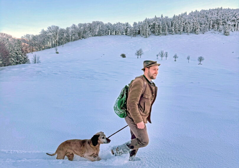 Mit den ersten Schritten in die Adventszeit öffnet sich, wie hier im Hofalm-Gebiet in Aschau i.Chiemgau, eine zauberhafte Winterlandschaft, die wirkt, als hielte die Welt für einen Moment den Atem an. Revierjagdmeister Josef Rinner von der Frhrl. v. Cramer-Klett’schen Jagd und seine Hündin Betty ziehen ihre Spur durch den frisch gefallenen Schnee – ein stiller Weg, der den sanften Zauber eines Neubeginns in sich trägt.