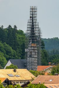 Der eingerüstete Turm der Frasdorfer Kirche St. Margaretha