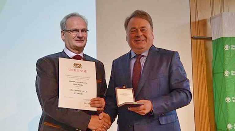 Mit der Staatsmedaille in Gold hat Landwirtschaftsminister Helmut Brunner den Generalsekretär des Bayerischen Bauernverbands (BBV), Hans Müller aus Aufkirchen (Lkr. Fürstenfeldbruck), ausgezeichnet. Der Minister würdigte damit die besonderen Verdienste des 64-Jährigen um die Land- und Forstwirtschaft in Bayern. „Mit Fachkompetenz, Weitblick und großem persönlichen Engagement haben Sie sich viele Jahre erfolgreich für die Belange der Bäuerinnen und Bauern im Freistaat eingesetzt“, sagte der Minister in seiner Laudatio. Als exzellenter Fachmann in der Agrar- und Verbandspolitik habe Müller den Anliegen der bayerischen Landwirte weit über die weißblauen Grenzen hinaus Stimme und Gewicht verliehen. Besonderes Anliegen sei ihm immer der Erhalt einer Vielzahl und Vielfalt wettbewerbsfähiger Familienbetriebe gewesen. In den fast zwei Jahrzehnten als Generalsekretär habe Müller maßgeblich dazu beigetragen, den BBV mit seinen vielen Tochterunternehmen und Organisationen zu einem breiten Dienstleister für die Landwirtschaft zu entwickeln. Darüber hinaus habe sich Müller unter anderem mit der Gründung der Dachorganisation „Ländliche Dienste Bayern“ und der Stiftung „Land und Leben“ des BBV auch im sozialen Bereich besondere Verdienste erworben.
