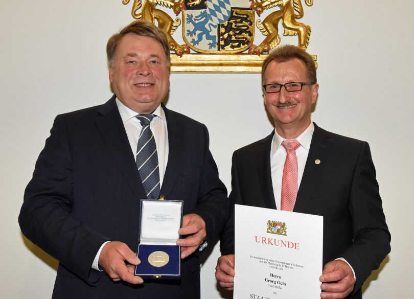 Mit der Staatsmedaille in Silber hat Landwirtschaftsminister Helmut Brunner den Vorsitzenden des Landesverbands Bayerischer Pferdezüchter, Georg Ochs aus Höflas bei Lauf an der Pegnitz (Lkr. Nürnberger Land), ausgezeichnet. Der Minister würdigte damit die besonderen Verdienste des 58-Jährigen um die Pferdezucht in Bayern. „Mit Fachkompetenz, Weitblick und herausragendem persönlichen Engagement haben Sie sich viele Jahre erfolgreich für die Belange der Pferdezüchter im Freistaat eingesetzt“, sagte der Minister in seiner Laudatio. Auch über die weißblauen Grenzen Bayerns hinaus habe Ochs den bayerischen Anliegen Stimme und Gewicht verliehen. „Die Einführung eines gemeinsamen Zuchtprogramms für das Deutsche Sportpferd ist maßgeblich Ihrem Einsatz in der Arbeitsgemeinschaft Süddeutscher Pferdezuchtverbände, der zweitgrößten Züchtergemeinschaft Deutschlands, zu verdanken“, so Brunner. Zudem kümmere sich Ochs als Landesvorsitzender und Gesellschafter mit viel betriebswirtschaftlichem Geschick um die Belange der Olympia Reitanlagen in München-Riem und könne darüber hinaus als Züchter mit „Leib und Seele“ eine Reihe beachtlicher Zuchterfolge beim Deutschen Sportpferd vorweisen.