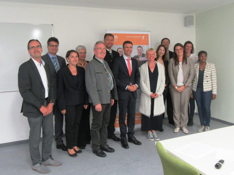 Foto: v.l.n.r: Prof. Dr. Rudolph Bäßler, Hochschule Rosenheim; Maximilian Heimerl, stv. CSU-Kreisvorsitzender; Claudia Hausberger, Bezirksrätin; Ilse Preisinger-Sontag, 2. Bürgermeisterin der Stadt Mühldorf a. Inn; Landrat Georg Huber; MdB Stephan Mayer; Parlamentarischer Staatssekretär Stefan Müller, MdB, BMBF; Dekanin Prof. Sabine Ittlinger, Prof. Dr. Katharina Lüftl, Wolfgang Alversammer, Stefanie von Maikowski, Magdalena Braun, Ricarda Servaty, alle Hochschule Rosenheim