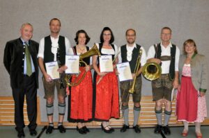 Bei den Ehrungen von links nach rechts Peter Gasser (Verabschiedung), Markus Landinger (25 Jahre aktives Musizieren) , Verena Wagner (25 Jahre), Franziska Langl (25 Jahre), Seppi Stocker (25 Jahre), Sepp Kaml (50 Jahre und neuer 2. Vorstand) sowie Annemarie Plank (1. Vorsitzende).