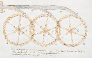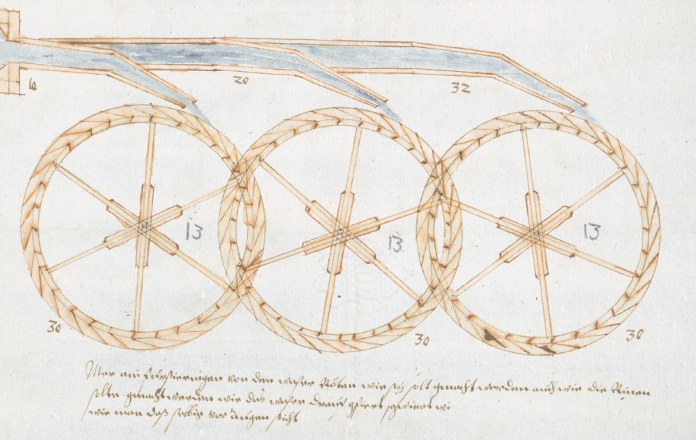 Konstruktionszeichnung von drei Wasserrädern einer Mahlmühle und “wie das waser drauf gefiert” wird, 1610, StadtA Wasserburg a. Inn, I1b207.