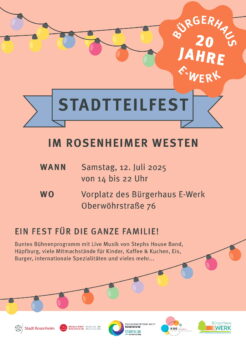 Das Stadtteilfest wird dieses Jahr auch mit einem Jubiläum verbunden: das Bürgerhaus E-Werk – das erste Bürgerhaus in Rosenheim – wurde vor 20 Jahren eröffnet. Das wird jetzt gebührend gefeiert. Dank dem vielfältigem Engagement zahlreicher Ehrenamtlicher und Dank der Mitwirkung vieler Vereine und Organisationen ist es auch dieses Jahr wieder gelungen ein buntes Programm auf die Beine zu stellen.
