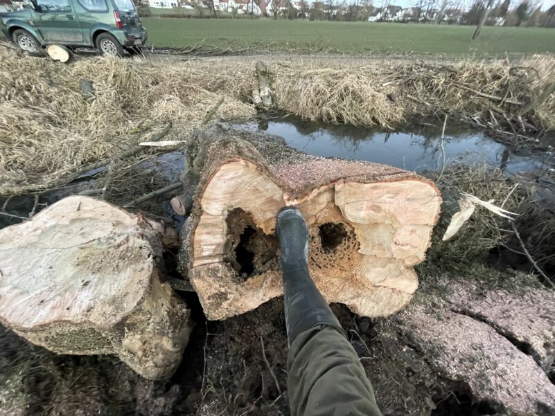 Hinzu kommt, dass Gewässer selbst bei leichten „Kurven“ im Gewässerverlauf im so genannten „Prallufer“ Material abtragen und auf diese Weise Wurzelstöcke freilegen. Auf diese Weise leidet die Wurzelverankerung im Boden nach und nach und irgendwann ist die erforderliche Stabilität nicht mehr gegeben. Die schlichte Konsequenz: der Baum fällt um. Kommt dann, wie im vorliegenden Fall, auch noch eine Stammfäule hinzu, dann beschleunigt sich der Prozess noch deutlich. Es ist also deutlich erkennbar, dass hier der Biber hier seine Finger bzw. Pfoten nicht im Spiel hatte.