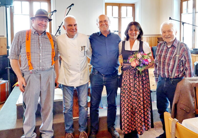 Traditionsgasthaus seit 30 Jahren im Familienbesitz – Im Rahmen der boarischen Faschingsgaudi gratulierten kürzlich stellvertretend für alle Gäste die treuen Stammgäste Sepp Schmelcher, Spenglermeister aus Ester, Hans Riedl, langjähriger Gemeinderat aus Jarezöd und Kreisrat Sepp Lausch aus Tattenhausen den Wirtsehepaar Katharina und Bernd Voigt Weichselbaumer zum dreißigjährigen Betrieb ihrer Gastwirtschaft mit einem Blumenstrauß.
