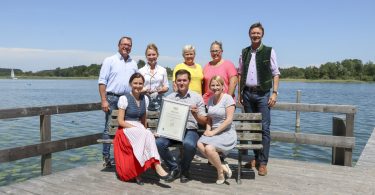 Bericht und Foto: Prien Marketing GmbH – Bildunterschrift: (von links hinten) Die Gäste Marita und Heinz Dosenbach, Marlies Mayer und Rudolf Pieper werden von der Mitarbeiterin des Tourismusbüros Prien Judith Schmidbauer, Gastgeber Robert Rosin und Geschäftsführerin der Prien Marketing GmbH Andrea Hübner geehrt.