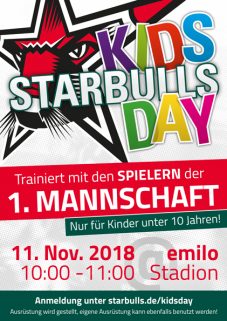 Hierzu findet am Sonntag, den 11. November 2018 der Starbulls KidsDay statt. Der Nachwuchs (ab 3 Jahren) hat die Möglichkeit seine ersten Schritte auf dem Eis mit Spielern der ersten Mannschaft machen und den Spaß am Eishockey kennenzulernen. Das Schnuppertraining beginnt um 10:00 Uhr und endet um 11:00 Uhr. Alles was benötigt wird sind (Fahrrad-)Helm und Handschuhe. Zusätzliche Ausrüstung steht vor Ort zur Verfügung.
