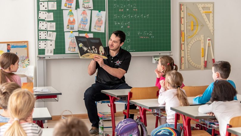 Die Spieler der Starbulls wurden bereits herzlich von Schülern und Lehrern empfangen. Danach teilten sich die vier auf mehrere Klassen auf, damit auch möglichst viele Schüler in den Genuss des Vorlesens kamen. Auf dem Programm standen natürlich Klassiker wie Max Kruses „Urmel fliegt ins Weltall“ oder „Die kleine Hexe“ von Ottfried Preußler. Die Kinder lauschten gespannt den Spielern, und auch diese hatten ihre Freude an den Geschichten, die sie selbst noch aus ihrer Kindheit kannten. Nach ca. 20 Minuten des Vorlesens spannender Abenteuer war noch genügend Zeit für gemeinsame Fotos, Autogramme und viele Fragen.