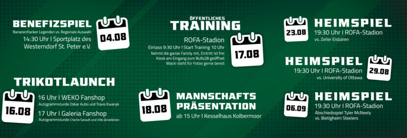 Einlass ab 9:30 Uhr, Beginn des Trainings 10 Uhr. Der Eintritt ist frei und für Verpflegung ist am Kiosk am Eingang zum Bulls 28 gesorgt. - 18.08.24 ab 15 Uhr Mannschaftspräsentation im Kesselhaus Kolbermoor