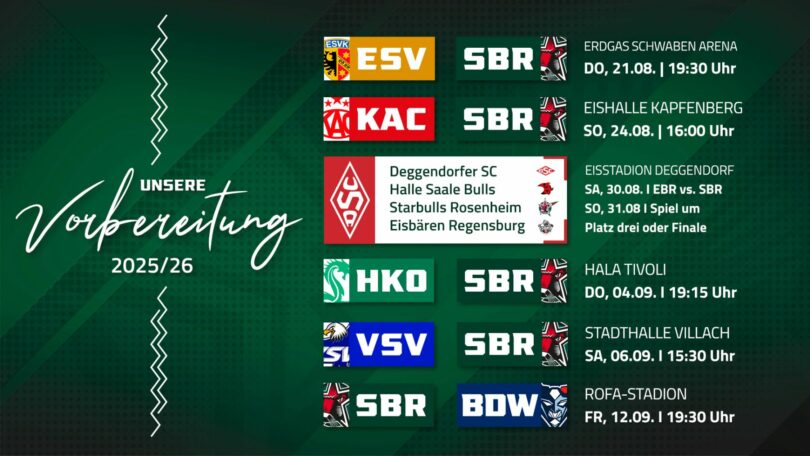 Damit umfasst das Vorbereitungsprogramm der Starbulls aktuell sieben Spiele. Neben dem Spiel gegen Kaufbeuren stehen unter anderem auch Begegnungen gegen internationale Teams wie Olimpija Ljubljana und den Villacher SV auf dem Plan. Ebenfalls fest terminiert ist die Teilnahme am Vorbereitungsturnier in Deggendorf mit den Saale Bulls Halle, Eisbären Regensburg und dem Deggendorfer SC. Das letzte Spiel der Vorbereitung findet am Freitag, den 12. September gegen die Blue Devils Weiden im ROFA-Stadion statt.