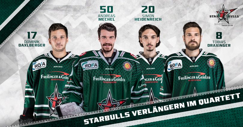 Der Starbulls Kader für die Saison 2020/2021 nimmt weiter Formen an: Torhüter Andreas Mechel, die Verteidiger Tobias Draxinger und Simon Heidenreich sowie der Angreifer Dominik Daxlberger tragen auch in der kommenden Spielzeit das Grün-Weiße Starbulls Trikot.