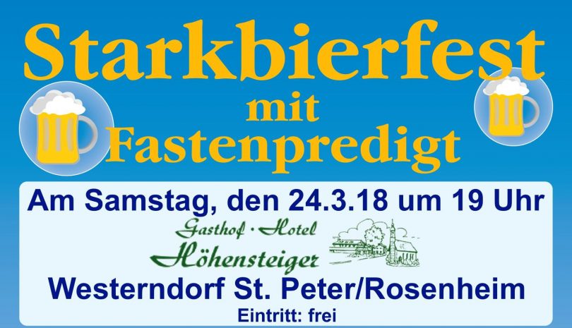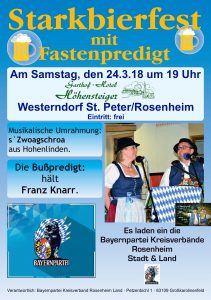 Ein Starkbierfest mit Bußpredigt von Franz Knarr veranstalten die Kreisverbände der Bayernpartei für Rosenheim Stadt und Land am Samstag, 24. März ab 19 Uhr im Gasthof Höhensteiger in Westerndorf St. Peter. Für die musikalische Umrahmung sorgt der Zwoagschroa aus Hohenlinden, der Eintritt ist frei.