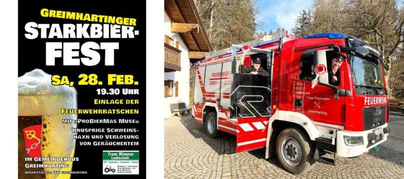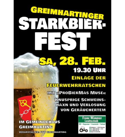Die Freiwillige Feuer Greimharting veranstaltet am Samstag, 28. Februar wieder ihr alljährliches Starkbierfest im Gemeindehaus Greimharting. Beginn der Veranstaltung ist um 19:30 Uhr.