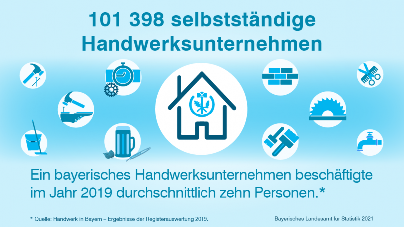 Laut Bayerischem Landesamt für Statistik gibt es in Bayern im Jahr 2019 insgesamt 101 398 selbstständige Handwerksunternehmen. Im Jahresdurchschnitt sind hier zusammen 963 850 Personen tätig. Der Vergleich zu 2018 zeigt: 0,2 Prozent weniger Unternehmen mit allerdings 0,5 Prozent mehr tätigen Personen. Zusammen erwirtschaften die Handwerksunternehmen im Freistaat in 2019 einen Umsatz von 125,37 Milliarden Euro. Das ist eine Mehrung von 3,8 Prozent gegenüber 2018. Von den 2019 im bayerischen Handwerk tätigen Personen sind 742 368 bzw. 77,0 Prozent sozialversicherungspflichtig Beschäftigte. 116 454 bzw. 12,1 Prozent gehören zur Gruppe der geringfügig entlohnten Beschäftigten. Die Anzahl sozialversicherungspflichtiger Beschäftigte steigt gegenüber 2018 um 1,5 Prozent. Geringfügig entlohnte Beschäftigte sind es um 4,6 Prozent weniger.
