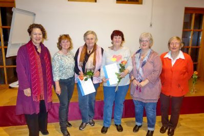 Aufgrund ihrer 25jährigen Mitgliedschaft beim Frauenbund Bernau-Hittenkirchen gab es aus den Händen von Bezirksleiterin Christine Penners und von Vorsitzender Christa Weingartner Blumen und Urkunden für Monika Lackerschmid, Liesl Schumacher und Hilde Wiesbeck. Blumen bekam auch die Erste Vorsitzende Christa Weingartner von Schatzmeisterin Helene Seehauser als Dank für die rührige Vereinsführung.