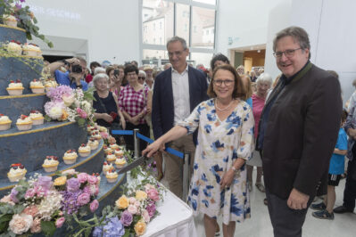 0085: Regensburgs Oberbürgermeistern Getrud Maltz-Schwarzfischer und Direktor Dr. Richard Loibl beim symbolischen Anschnitt der barocken Torte nach der feierlichen Eröffnung, links Kulturreferent Wolfgang Dersch © Haus der Bayerischen Geschichte | Foto: | Foto: www.altrofoto.de