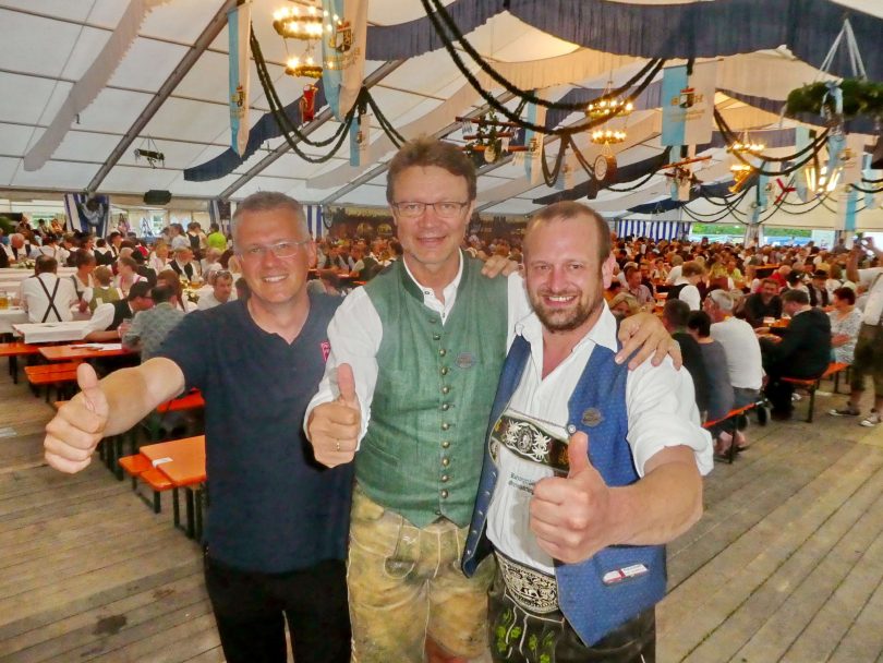 Foto: Hötzelsperger – Bodo Sagebiel von der Feuerwehr (li.) und Stefan Hackenberg von der Blaskapelle (re.) waren mit Bürgermeister Jürgen Seifert zufrieden über die Jubiläumsfeste im Vorjahr
