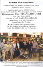 Zu den Aufgaben des Teams vom Priener Seniorenprogramm gehört auch der Priener Einkaufsdienst. Dieser Dienst ist für Bürger, die nicht mehr selbst einkaufen gehen können. Bestellungen nimmt EDEKA-Coban in der Hochriesstraße immer dienstags von 9 Uhr bis 12 Uhr unter 08051-1012 oder per email über info@edeka-coban.de an. Die bestellten Waren werden dann am darauffolgenden Freitag vom Senioren-Betreuungs-Team ausgeliefert. Nähere Informationen für diesen Einkaufsdienst gibt es bei Senioren-Betreuerin Burgl Mouratian, Telefon 08051-5108.